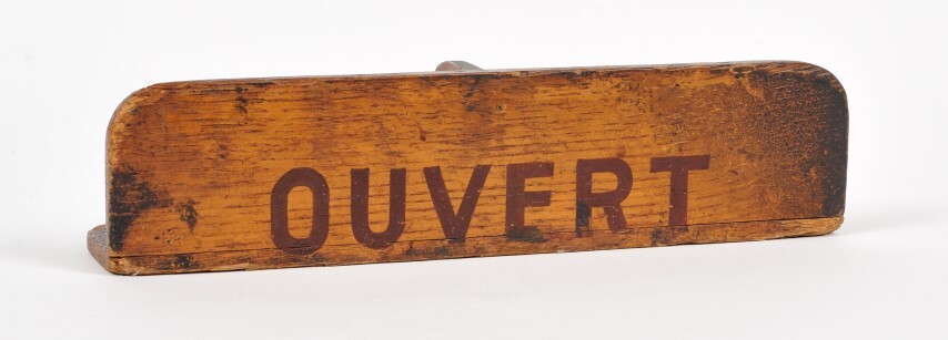 BeschrijvingHouten bord met voet dat op een loket kon worden gezet om aan te duiden wanneer het loket open of gesloten is.