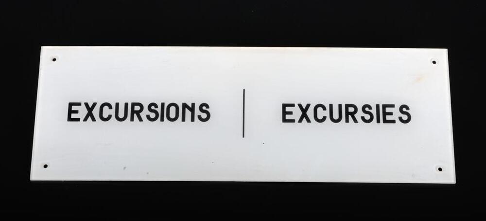 BeschrijvingWit kunststoffen bord met zwarte letters. Werd boven een loket gehangen waar de reizigers biljetten konden kopen voor een excursie van de NMBS.