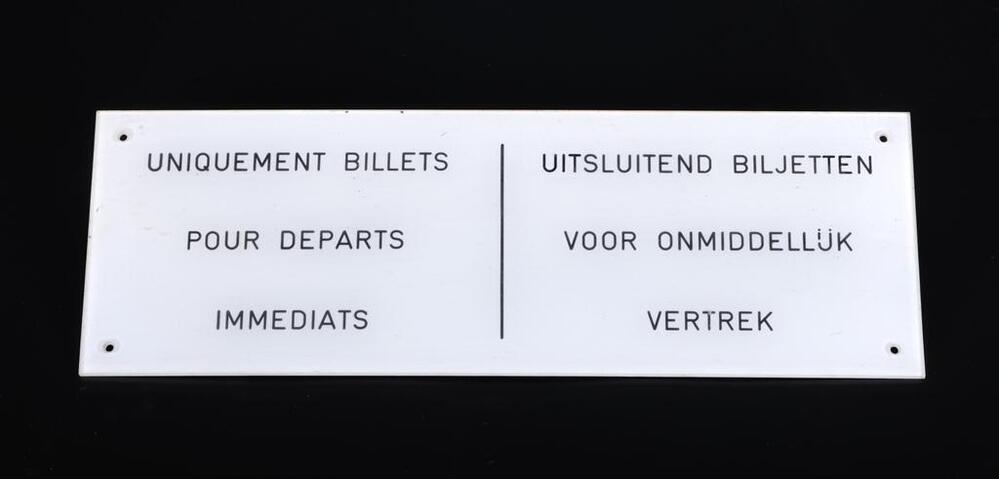 BeschrijvingWit kunststoffen bord met zwarte letters. Werd boven een loket gehangen waar reizgers biljetten konden kopen voor een trein die de dag zelf vertrok.