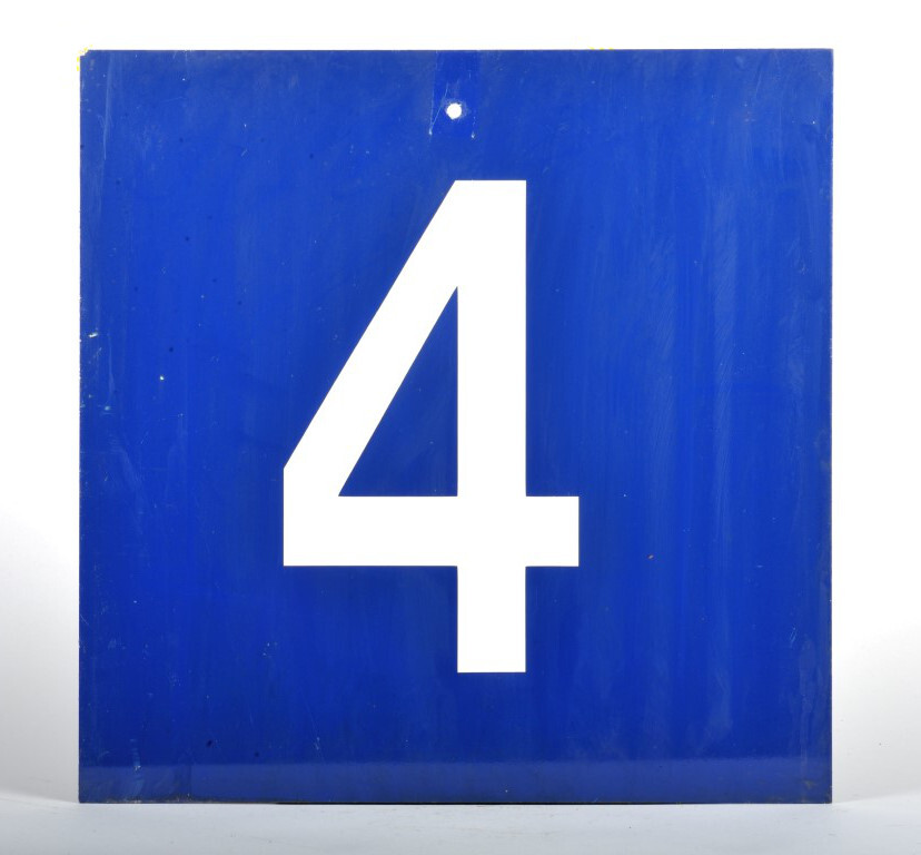 BeschrijvingBlauw bord met witte cijfers dat gebruikt werd om perron 4 aan te duiden. Het cijfer staat op de voor- en achterzijde.