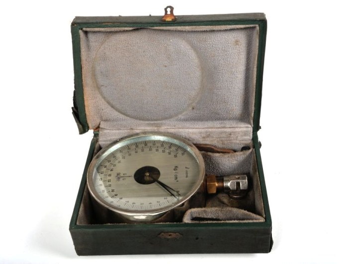 BeschrijvingEen manometer is een meetinstrument waarmee druk wordt gemeten. Deze manometer zit ongemonteerd in een doosje en heeft een dubbele wijzerplaat tot eenheid 25 kg/cm² en twee wijzers. Er zitten ook koppelstukken in de doos.