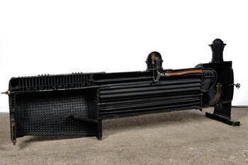 BeschrijvingDit schaalmodel toont de binnenzijde van een stoomlocomotief met inspringende vuurhaard. We zien de vuurbrug, de stoomdom met regulator, de vlam- en oververhittingspijpen, de uitlaat, de rookkast en de schoorsteen.