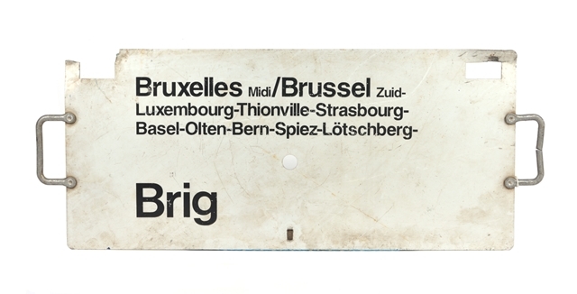 Dit ritbord werd aan de zijkant van de trein gehangen en toont de stopplaatsen: 'Bruxelles Midi/Brussel Zuid - Luxembourg - Thionville - Strasbourg - Basel - Olten - Bern - Spiez - Lötschberg - Brig'. Op de andere kant van het bord wordt de omgekeerde route beschreven.