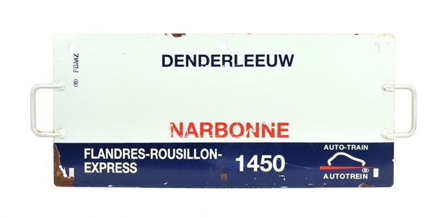 Dit ritbord werd aan de zijkant van de internationale autotrein gehangen van Denderleeuw naar Narbonne. De andere kant van het bord toont de omgekeerde route van de trein. Rechts opzij staat het logo van de NMBS en dat van de autotreinen.