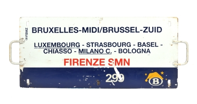 Dit ritbord werd aan de zijkant van de internationale autotrein gehangen en toont de verschillende haltes: 'Bruxelles-Midi/Brussel-Zuid Luxembourg - Strasbourg - Basel - Chiasso - Milano C. - Bologna Firenze Smn'. Op de achterkant van het bord zien we de omgekeerde route van de trein met volgende stopplaatsen: Firenze SMN Bologna - Milano C. - Chiasso Basel - Strasbourg Luxembourg - Namur Bruxelles-M./Brussel-Z.' Rechts opzij staat het logo van de NMBS met een gele slaapmuts en enkele gele sterren.