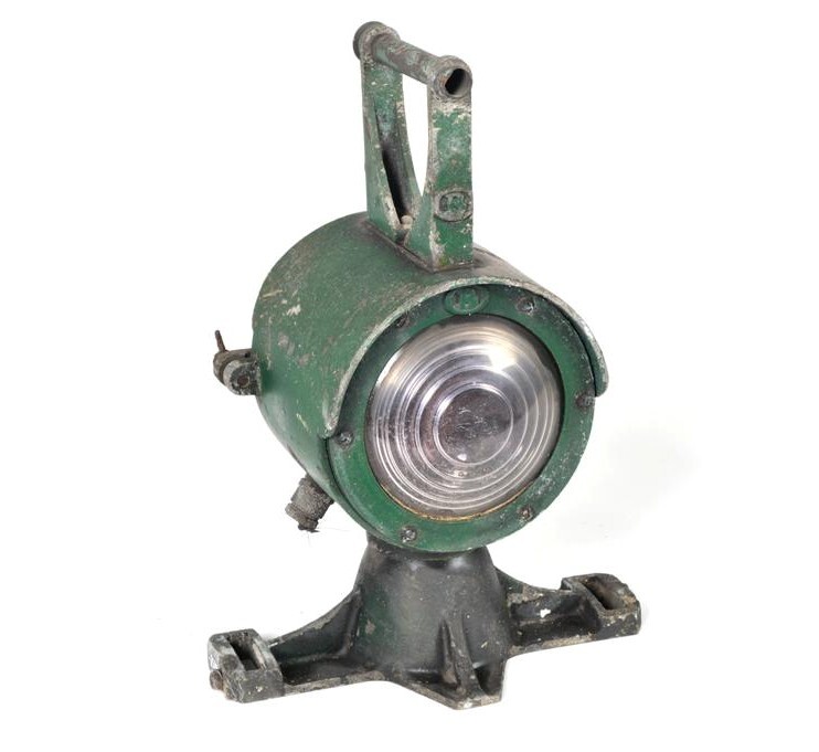 BeschrijvingDeze groene elektrische lamp werd aan een seinpaal bevestigd voor het geven van nachtseinen. Door het buisje bovenaan kon de lamp goed gericht worden. Op verschillende plaatsen is het NMBS-logo aangebracht.