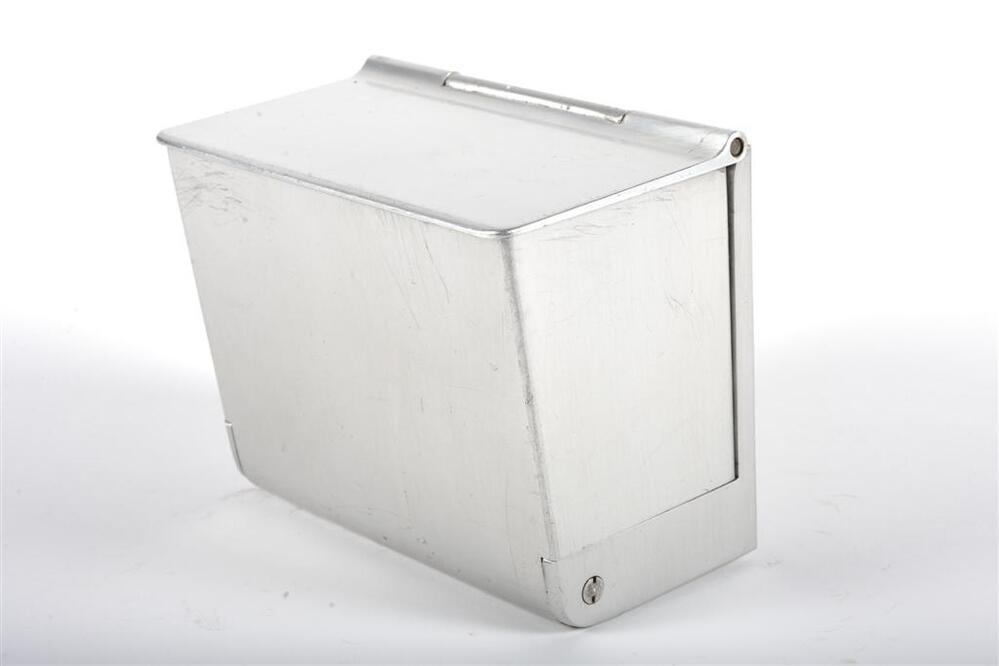 BeschrijvingDit metalen vuilbakje met klep werd bevestigd aan de wand van een rijtuig. Op de achterkant staat het NMBS-logo.