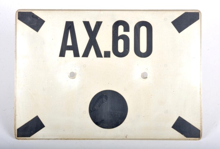 Dit witte bord met zwarte opschriften werd aan een sein gehangen ter identificatie. Het opschrift 'AX.60' duidt erop dat het sein geldt voor spoor A op tegenspoor (X), wat wil zeggen dat het sein rechts van het spoor stond in plaat van links zoals gebruikelijk. Het sein bevond zicht ter hoogte van kilometerpaal 60 op de lijn. De zwarte bol onder het opschrift geeft aan dat het hier om een gecombineerd sein (zowel stop- als waarschuwingssein) gaat. De zwarte streepjes in elke hoek duiden nogmaals aan dat het seinbord geldt voor het tegenspoor. In het midden van het bord zijn twee gaatjes om het te kunnen bevestigen.