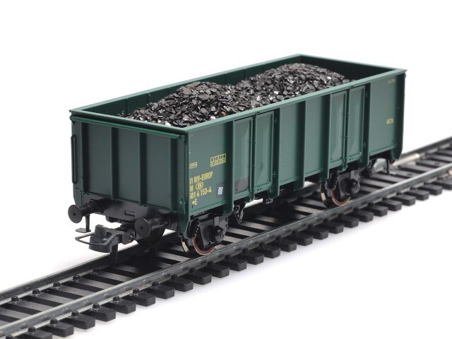Deze groene stortwagen met kolenlading heeft als lettercode E (open wagen met hoge schotten), wagennummer 01 88 501 4 153-4 en typenummer 1215A. De wagen heeft aan beide zijkanten twee deuren om de goederen makkelijker uit te storten. Op de zijkanten staan verschillende opschriften, zoals het wagennummer, 'Europ' en het logo van de NMBS. De maquette werd op schaal H0 1/87 vervaardigd.