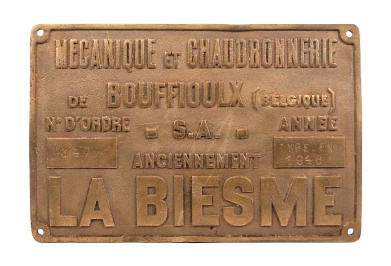 Deze rechthoekige metalen plaat werd door de constructeur ter identificatie aangebracht op het door hem vervaardigde rollend materieel. Ze bevat het opschrift: 'Mecanique et chaudronnerie de Bouffioulx (Belgique) N° d'ordre - S.A. - Année Anciennement La Biesme'. Op elke plaat wordt een fabricatienummer (o.a. 347, 348 en 349) en een datum (tussen 1946 en 1948) vermeld.