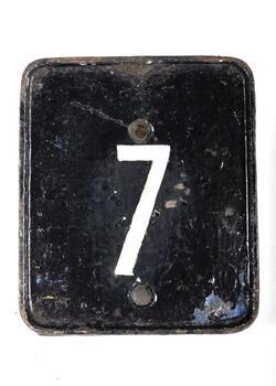 TitelZwart plaatje met cijfer '7' voor een handel van een mechanisch seingestel