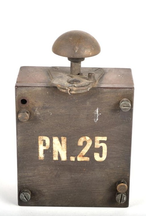 Houten kistje met bovenaan een metalen drukknop dat aan een seingestel bevestigd werd. Wanneer men een sein of wissel veranderde in het seinhuis drukte men op deze bloktaster om zo het eerstvolgende seinhuis op de lijn te waarschuwen voor de aankomende trein. Op de voorkant van deze bloktaster staat 'PN.25'.