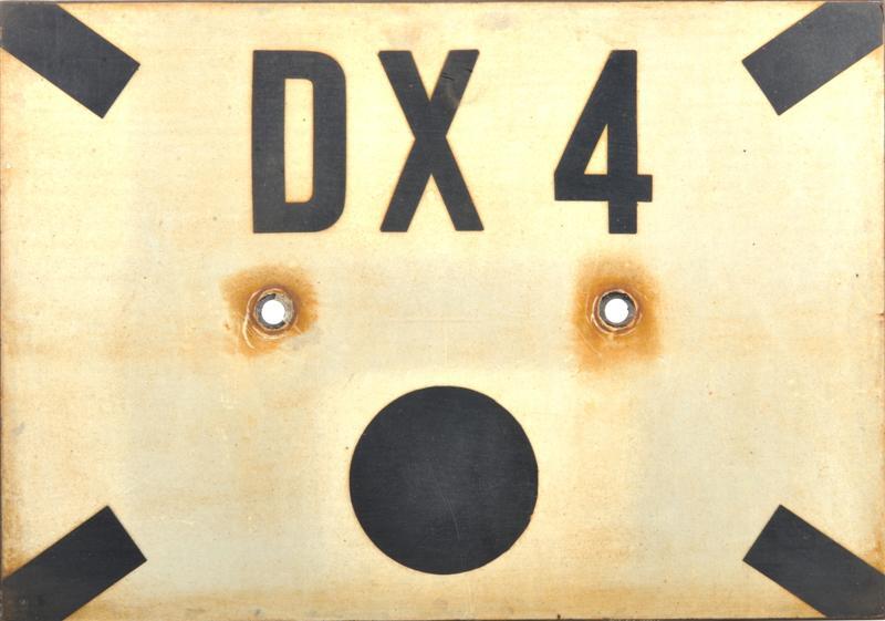 Dit witte bord met zwarte opschriften werd aan een sein gehangen ter identificatie. Het opschrift 'DX 4' wil zeggen dat het om een bediend sein gaat (D), dat bediend wordt door blokpost 4. Het sein geldt voor tegenspoor (X), wat wil zeggen dat het sein rechts van het spoor stond in plaat van links zoals gebruikelijk. De zwarte bol onder het opschrift geeft aan dat het hier om een gecombineerd sein (zowel stop- als waarschuwingssein) gaat. De zwarte streepjes in elke hoek duiden nogmaals aan dat het seinbord geldt voor het tegenspoor. In het midden van het bord zijn twee gaatjes om het te kunnen bevestigen.