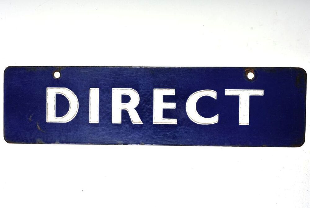 BeschrijvingBlauw bordje met witte letters. Werd aan een treinaankondiger gehangen om een directe trein aan te kondigen.