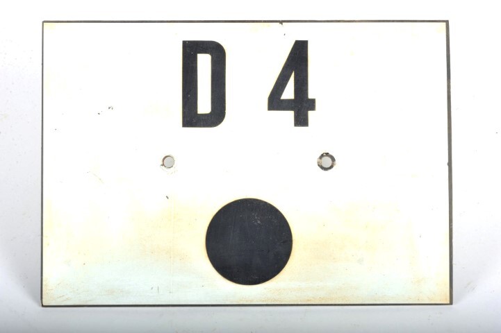 Dit witte bord met zwarte opschriften werd aan een sein gehangen ter identificatie. Het opschrift 'D 4' wil zeggen dat het om een sein gaat dat bediend wordt door blokpost 4. De zwarte bol onder het opschrift geeft aan dat het hier om een gecombineerd sein (zowel stop- als waarschuwingssein) gaat. In het midden van het bord zijn twee gaatjes om het te kunnen bevestigen.