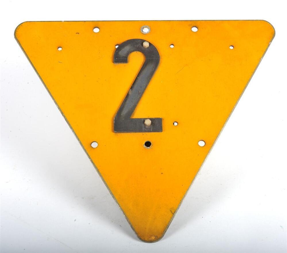 BeschrijvingGeel driehoekig bord met de punt omlaag, waarop een zwarte '2' staat. Het bord geeft aan dat de treinbestuurder zijn snelheid moet verminderen tot 20 km/u.
