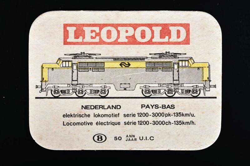 Afbeelding van een Nederlandse elektrische locomotief reeks 1200 op een bierviltje van 'Leopold'. Het logo van de NMBS staat ook op het bierviltje, alsook het opschrift '50 ann jaar U.I.C'.