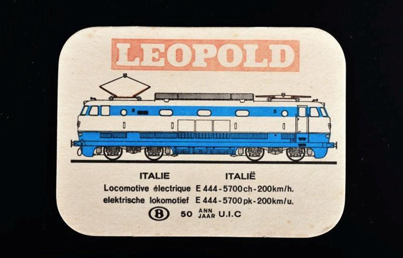 Afbeelding van een Italiaanse elektrische locomotief E444 op een bierviltje van 'Leopold'. Het logo van de NMBS staat ook op het bierviltje, alsook het opschrift '50 ann jaar U.I.C'