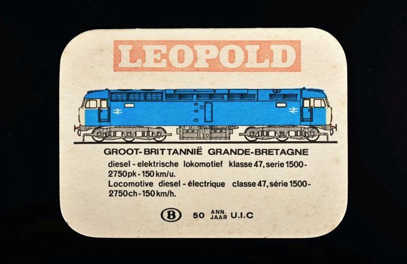 Afbeelding van een Britse diesellocomotief klasse 47, reeks 1500 op een bierviltje van 'Leopold'. Het logo van de NMBS staat ook op het bierviltje, alsook het opschrift '50 ann jaar U.I.C'