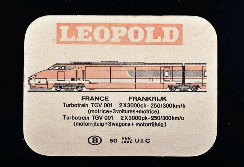 Afbeelding van de stuurpost van een Franse TGV-trein op een bierviltje van 'Leopold'. Het logo van de NMBS staat ook op het bierviltje, alsook het opschrift '50 ann. jaar U.I.C'