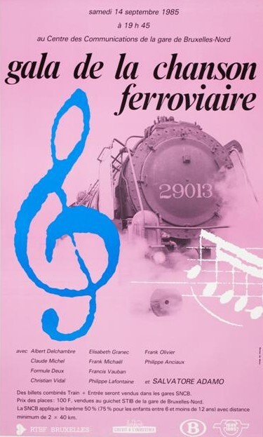 Deze affiche maakt reclame voor een zangavond in station Brussel-Noord. Op de roze affiche staat een zwartwitfoto van het vooraanzicht van stoomlocomotief 29.013 met daarnaast een blauwe solsleutel met witte partituur. Onderaan staan de gasten: 'avec Albert Delchambre Elisabeth Granec Frank Olivier Claude Michel Frank Michaël Philippe Anciaux Formule Deux Francis Vauban Christian Vidal Philippe Lafontaine et Salvatore Adamo' en de prijzen: 'Des billets combinés Train + Entrée seront vendus dans les gares SNCB. Prix des places: 100 F, vendues au guichet STIB de la gare de Bruxelles-Nord. La SNCB applique le barème 50% (75% pour les enfants entre 6 et moins de 12 ans) avec distance minimum de 2 x 40 km. De logo's van de NMBS, 'Société Nationale de Credit à l'Industrie' en de 'RTBF Bruxelles' staan ook onderaan.