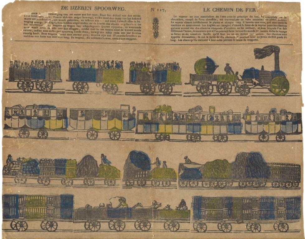 BeschrijvingIngekleurde afbeelding van een trein bestaande uit een stoomlocomotief, open bankwagens, diligences en verschillende goederenwagens. Bovenaan wordt de werking van stoomlocomotieven in het Frans en het Nederlands uitgelegd.