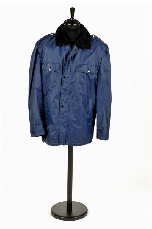 Deze blauwe jas is van polyester gemaakt en kan door middel van een rits en drukknopen worden gesloten. De binnenkant en de kraag zijn gevoerd. De jas heeft twee steekzakken en twee borstzakken. De borstzakken kunnen door een metalen knoop met afbeelding van een klauwende leeuw gesloten worden. Binnenin bevindt zich nog een borstzakje en twee verborgen zakken met ritsen.
