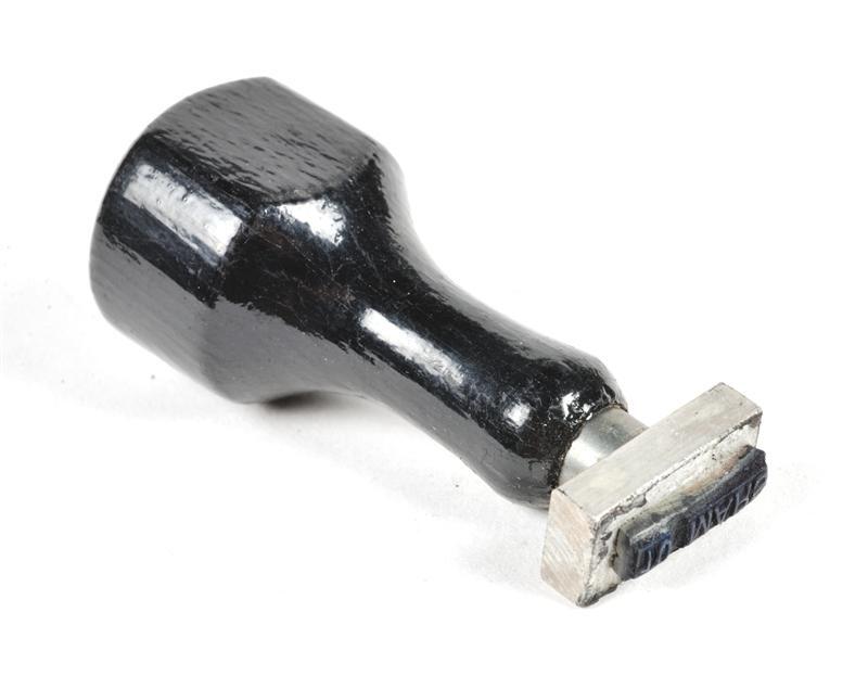 TitelMetalen stempel '10 mars' met houten handvat