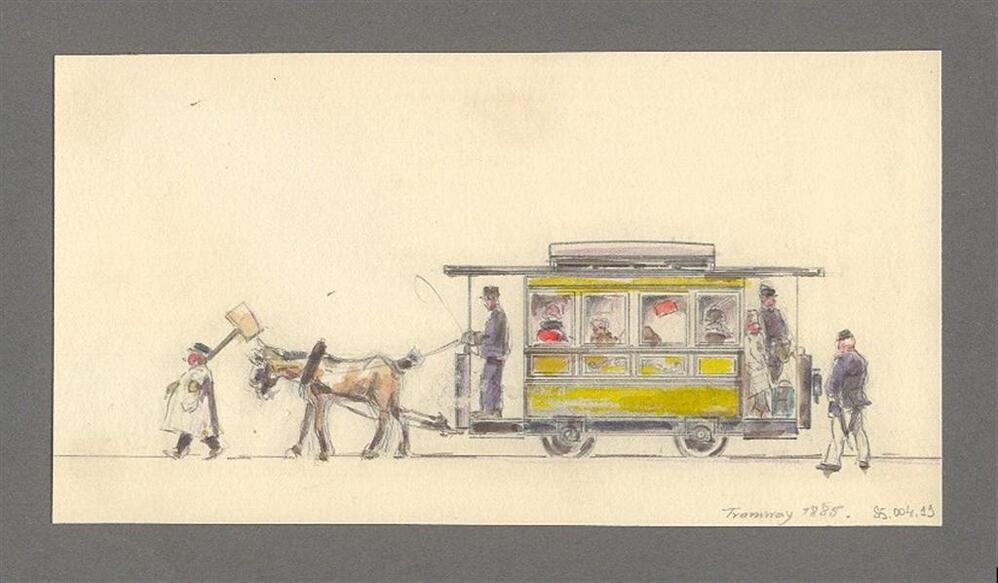 Ingekleurde tekening van een gele paardentram getrokken door twee paarden. Op de tram zitten verscheidene passagiers en voor en achter de tram lopen twee mannen. Onderaan staat 'Tramway 1885'. De tekening is afkomstig uit "Projet pour le cortège 1935, Locomotion Publique", een voorstudie voor een historische stoet in 1935, ter gelegenheid van 100 jaar Belgische Spoorwegen.