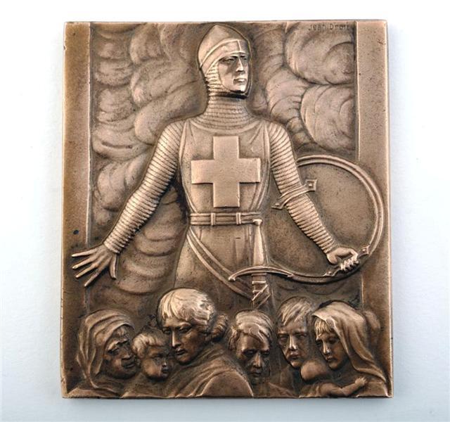 Op de voorzijde werd een ridder met schild en zwaard afgebeeld. Op zijn borst staat een verkort kruis (ook wel het Kruis van Genève genoemd; het symbool van het Rode Kruis). Onderaan zien we de gezichten van zeven mensen, zowel mannen, vrouwen als kinderen. Op de achterzijde staat het opschrift 'Croix Rouge de Belgique A Mr. L. Leroy'. Dit aandenken behoorde toe aan Leopold Leroy, gewezen eerste stationschef van Brussel-Noord. Schenking van mevr. Leroy.