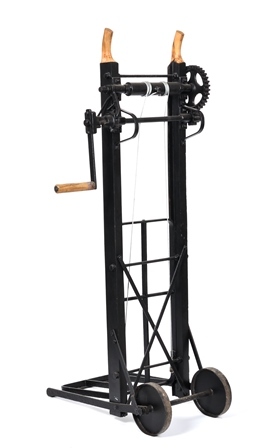 BeschrijvingDeze zwarte kar diende om ladingen op te heffen, te vervoeren en te stapelen.