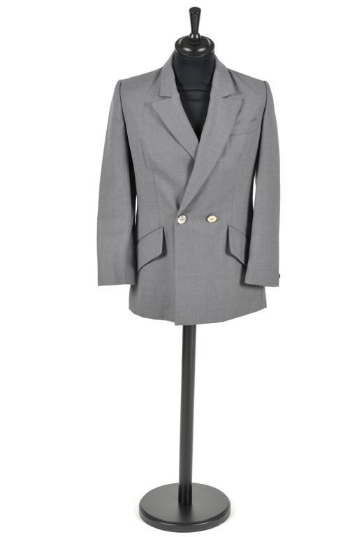 Dit grijze uniformjasje werd gesloten door één dubbele rij knopen. Er bevindt zich één knoopje aan elke manchet. Vooraan bevinden zich twee zakken en een borstzakje, binnenin zijn er twee borstzakjes.