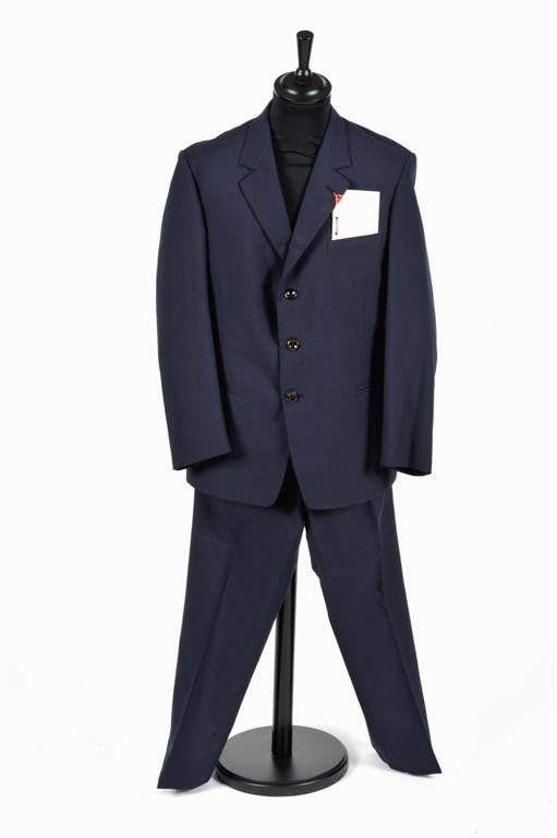BeschrijvingDit donkerblauwe kostuum bestaat uit een jasje en een broek. Het gevoerde jasje wordt door drie knopen gesloten. Vooraan heeft het twee zakken en één borstzakje. De broek heeft knoopjes en een metalen sluiting.