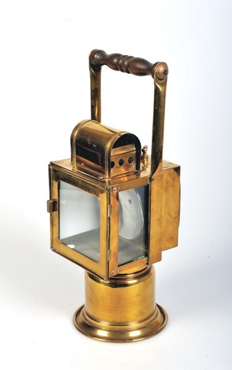 Deze vierkante petroleumlantaarn heeft drie glazen zijden. De voorste zijde kon vervangen worden door een glasplaatje in een kleur naar keuze. Eén van de glaasjes aan de zijkant is vervangen door een wit plaatje. De lantaarn is geplaatst op een voet die diende als reservoir.