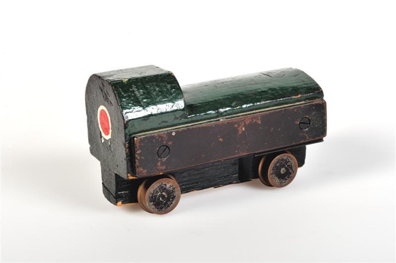 BeschrijvingDit groene speelgoedlocomotiefje heeft vooraan een witte cirkel en achteraan een rode cirkel die de treinlantaarns voorstellen. De locomotief heeft vier wielen waarvan de voorste twee aan een draaistel werden bevestigd.