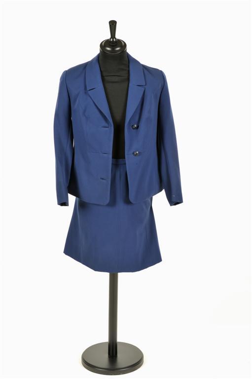 BeschrijvingDit donkerblauwe pak bestaat uit een jasje en een kokerrok, beide gevoerd. Het jasje heeft normaal gezien drie knopen en de rok heeft aan de achterkant een rits en een metalen haakje als sluiting.