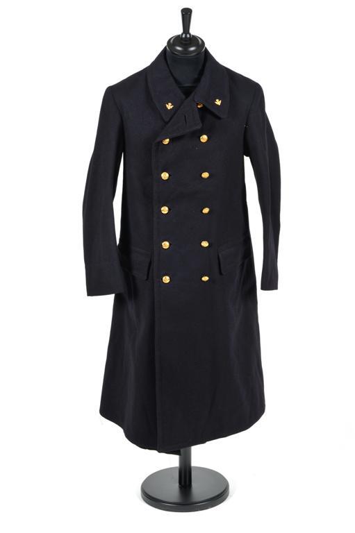 Deze wollen overjas heeft een dubbele rij koperkleurige knopen, twee steekzakken en spoorweginsignes op de revers. De knopen zijn versierd met een afbeelding van het gevleugeld en gekroond wiel. De voering is van grijze wol en aan de mouwen van een gestreepte zijden stof. Binnenin bevindt zich een borstzakje.