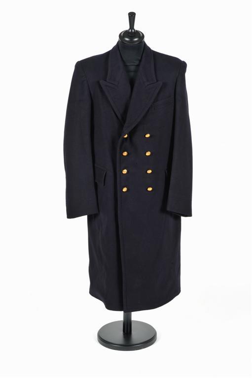 BeschrijvingDeze wollen overjas heeft een dubbele rij koperkleurige knopen, twee grote zakken en een borstzakje. De knopen zijn versierd met een afbeelding van het gevleugeld en gekroond wiel. De binnenkant werd gevoerd en heeft twee zakjes.