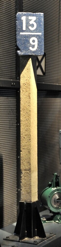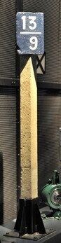 BeschrijvingDe betonnen paal is wit geschilderd. Bovenaan is een driehoekvormige top met opschrift '13/9'. De top is blauw, de cijfers zijn wit. Deze paal bevond zich op 100 meter van kilometerpaal 14.