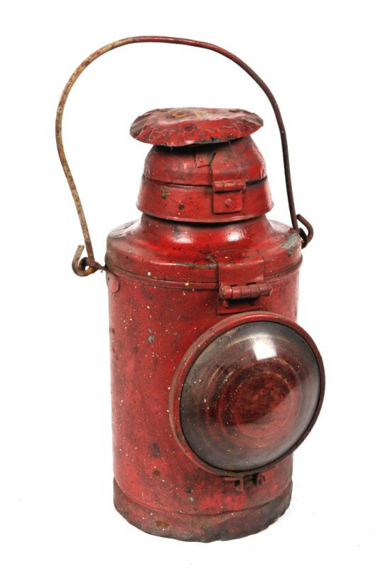 BeschrijvingDeze rood geverfde lantaarn heeft vooraan een rode glasplaat en bovenaan een handvat. Binnenin bevindt zich een petroleumreservoir.