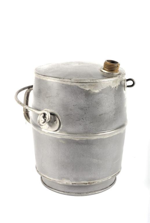 Metalen cilindervormige oliekan met bovenaan een kleine opening waarop een dop geschroefd kon worden. Er is een vast handvat achteraan en een beweegbaar handvat aan de zijkanten. Vermoedelijk werd deze oliekan door machinisten en stokers gebruikt om hun spuiten van olie te voorzien voor het smeren van de onderdelen van een stoomlocomotief.