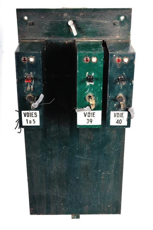 BeschrijvingDit onderdeel maakte deel uit van een seingestel, voor de bediening van spoortoestellen en seinen. Het bestaat uit drie blokpedaalrelais.