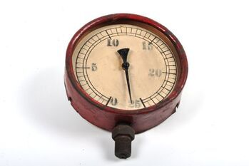 BeschrijvingRond metalen meetinstrument met wijzerplaat van 0 tot 25. De buitenkant is rood geverfd. De stuurpost van een stoomlocomotief was uitgerust met meerdere manometers om de druk te kunnen meten in de stoomketel, stoomschuif, remleiding en verwarmingsinstallatie van de trein.