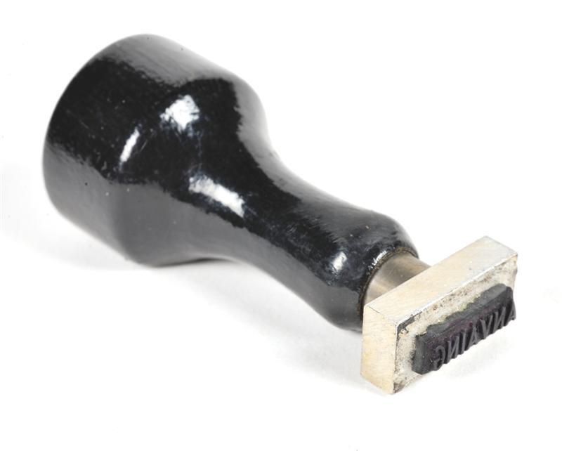 TitelMetalen stempel 'Anvaing' met houten handvat