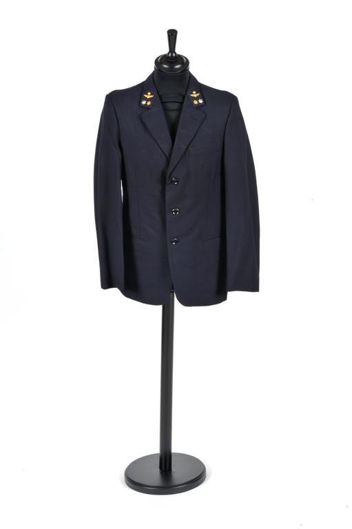 Dit blauwe uniformjasje wordt door drie kunststoffen knopen gesloten. Vooraan bevinden zich twee zakken en één borstzakje, binnenin zijn er twee borstzakjes. Op de revers werden er enkele spoorweginsignes aangebracht: een zilverkleurige ster, een goudkleurige ster en een gevleugelde en gekroonde letter B.