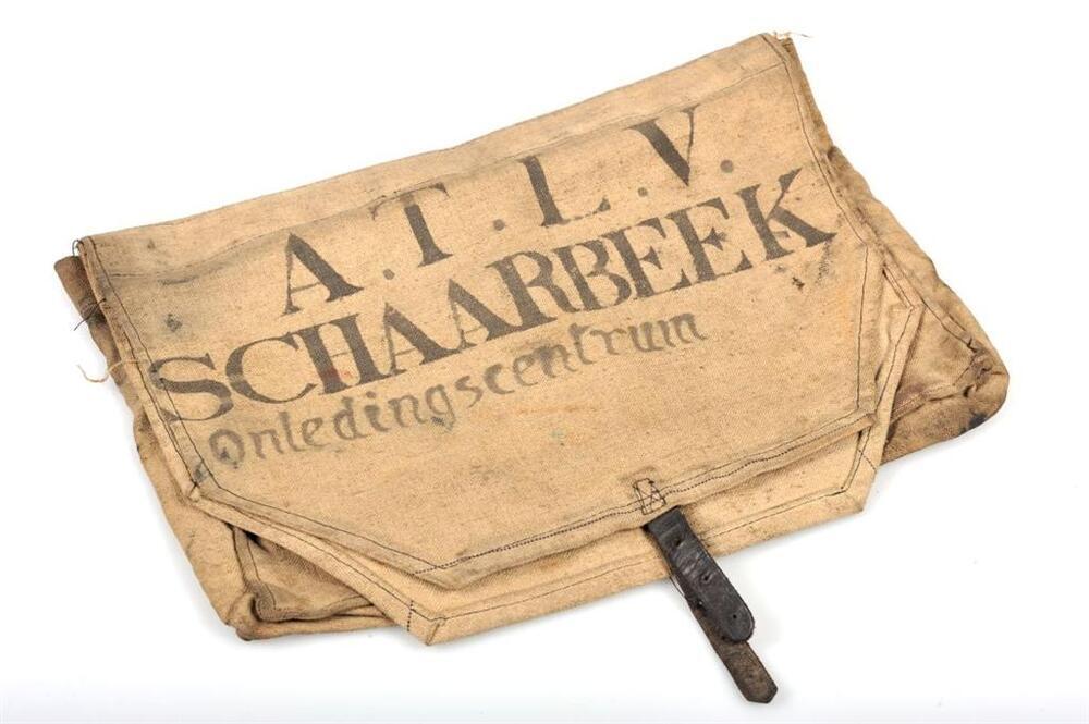 Zak uit canvas voor briefwisseling tussen de werkplaatsen van Leuven en Schaarbeek. De bestemmingen staan op beide zijden van de zak vermeld: ATLV staat voor 'Atelier de Traction de Locomotives à Vapeur'. Het 'onledingscentrum' was het bureau waar de registratiebanden uit TELOC-meters en andere controleapperatuur in de treinen werd gecontroleerd. Door de leren riempjes aan de metalen sluiting te bevestigen kan de tas gesloten worden.