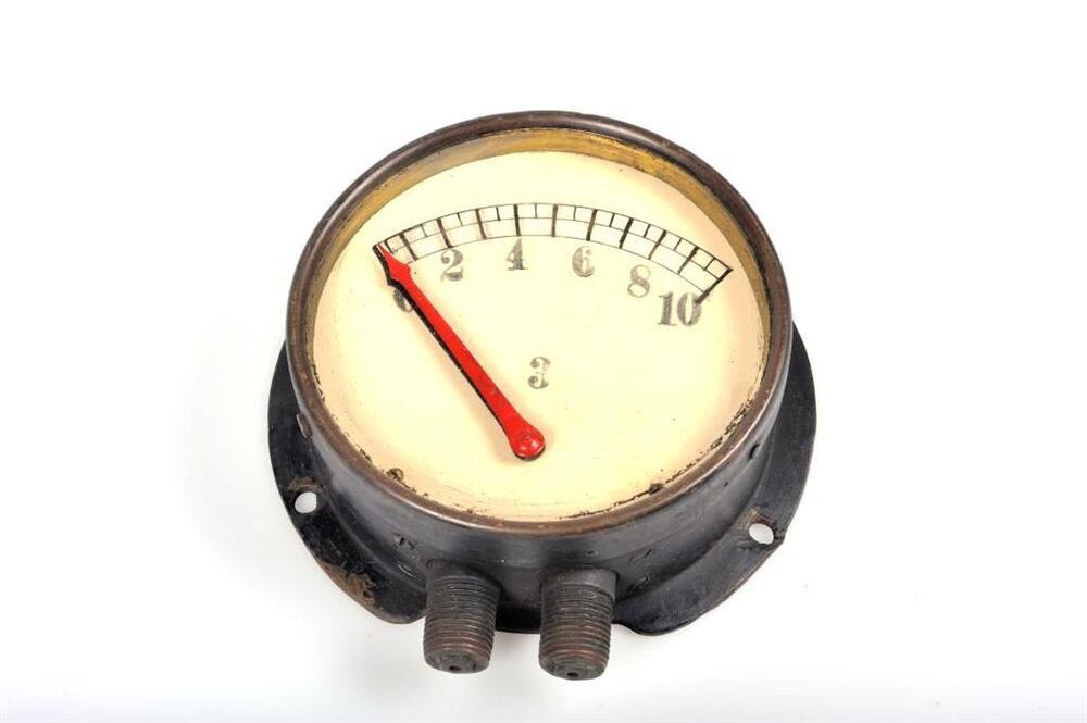 BeschrijvingRonde manometer met een wijzerplaat die gaat van 0 tot 10, maar geen eenheid vermeld. Boven de wijzer staat het cijfer 3. Gelet op de dubbele leiding gaat het vermoedelijk om een manometer die gebruikt werd om de druk in de remleidingen van een trein te meten.