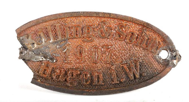 BeschrijvingOvale plaat waarop 'Killing & Sohn 1907 Hagen i.W.' vermeld staat. Dit bedrijf werd in 1858 opgericht en begon vanaf 1868 met de constructie van wielassen, goederenwagens en rijtuigen. In mei 1928 sloot de fabriek voorgoed haar deuren.