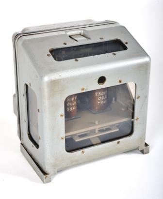 BeschrijvingGrijze metalen bak met bovenaan en aan de zijkanten verschillende glazen raampjes die een zicht bieden op twee spoelen.