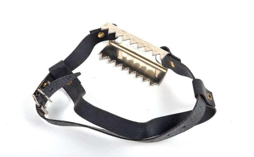 BeschrijvingHet hielijzer wordt onder de schoen van de spoorwegarbeider gebonden en biedt bescherming tegen uitglijden op sneeuw, ijzel of rijm.